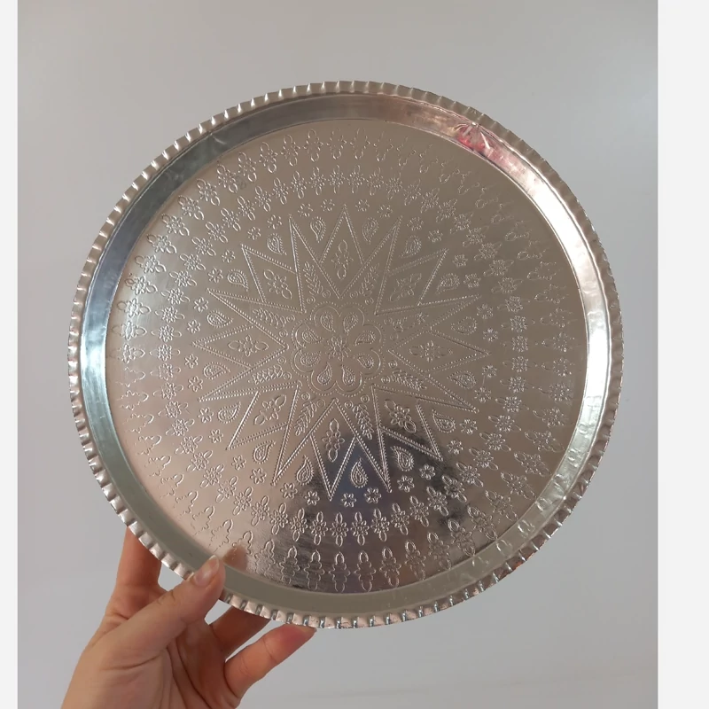 سینی پذیرایی روحی گرد نقره ای قطر 28 طرح برجسته
