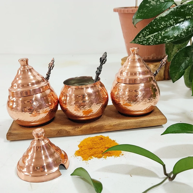 جا ادویه مسی مدل جدید هفت تایی با یک قاشق چوبی با ظرف بزرگ دردار