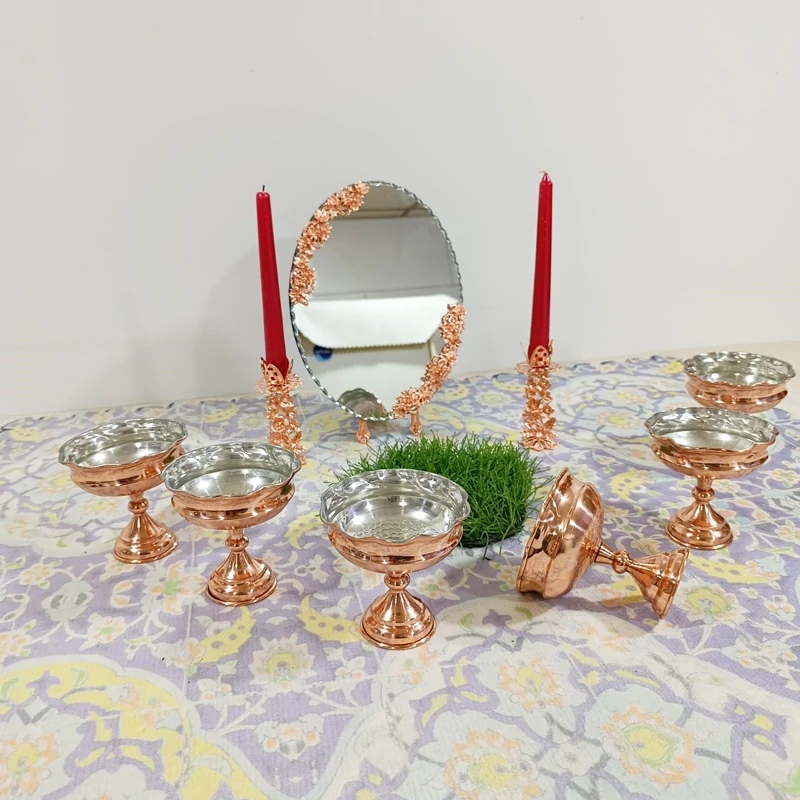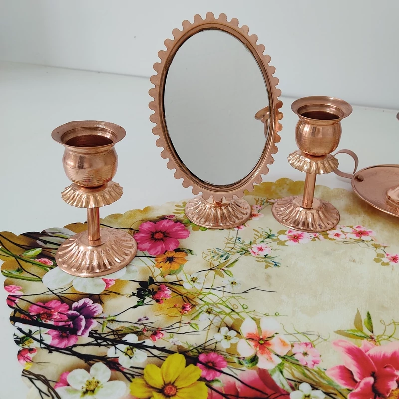 هفت سین مسی شش تایی و آینه شمعدان گلبرگ مسی زیبا