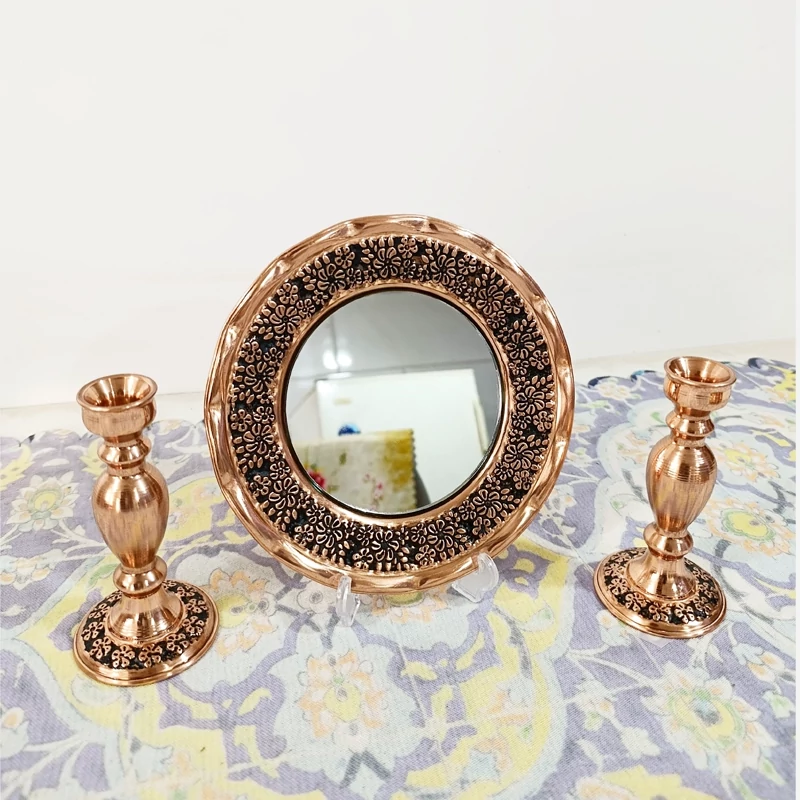 آیینه شمعدان مسی دست ساز سفره هفت سین گل کاری برجسته