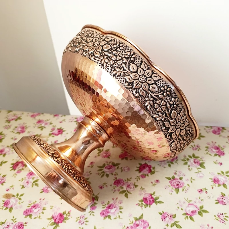 ظرف مسی گل کاری شده قطر 22 مناسب میوه و آجیل رنگ ثابت