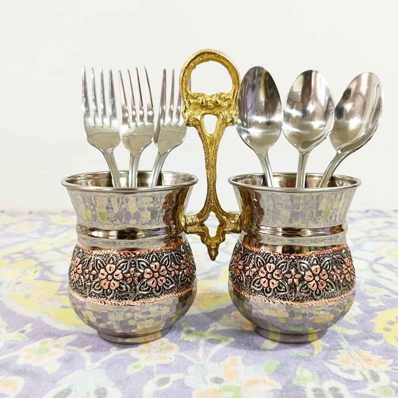 جا قاشقی دوقلو مسی گل برجسته تراش شده دو رنگ