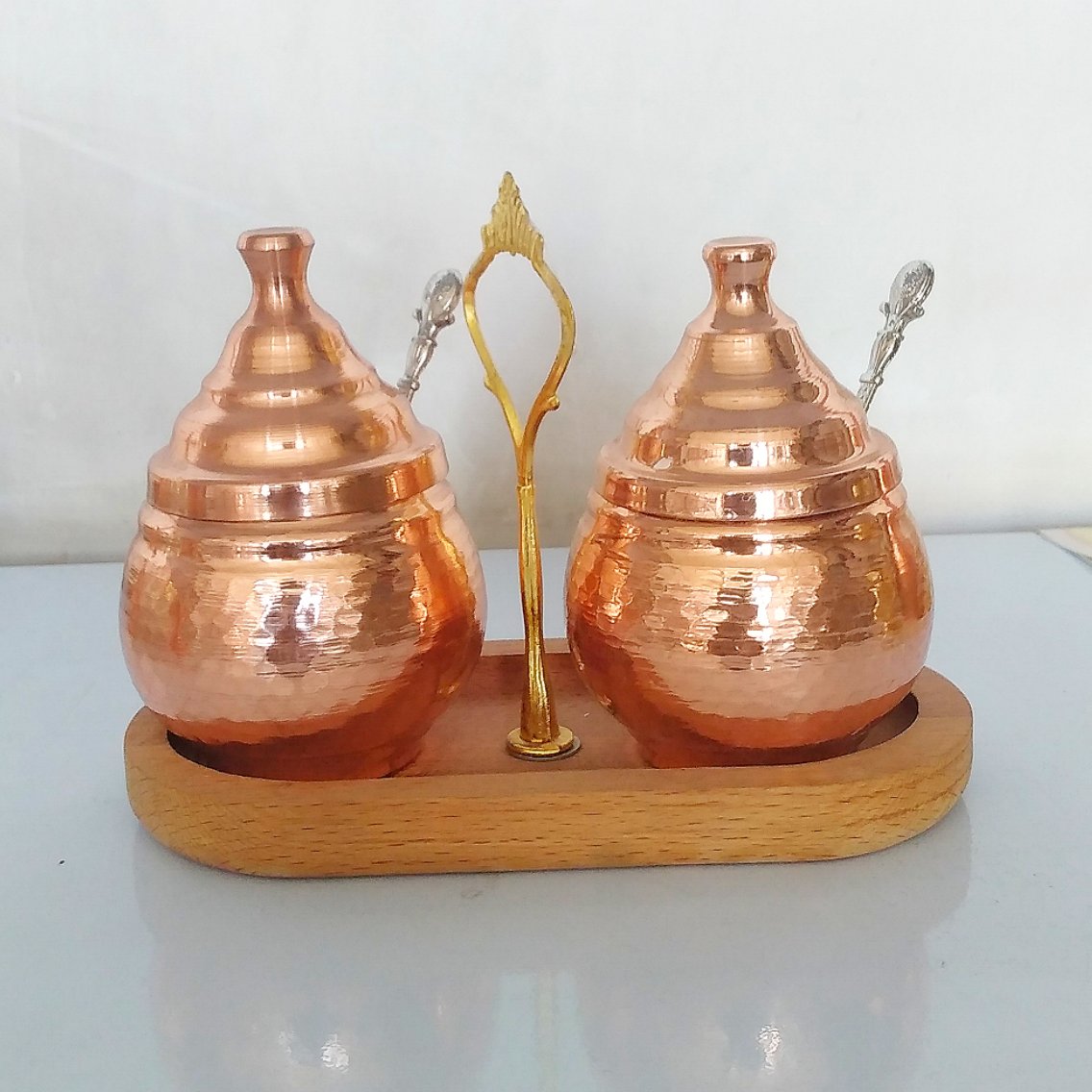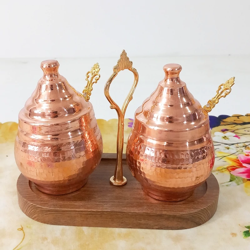 مربا خوری مسی دوتایی قاشق دار با استند چوبی (مناسب ادویه )