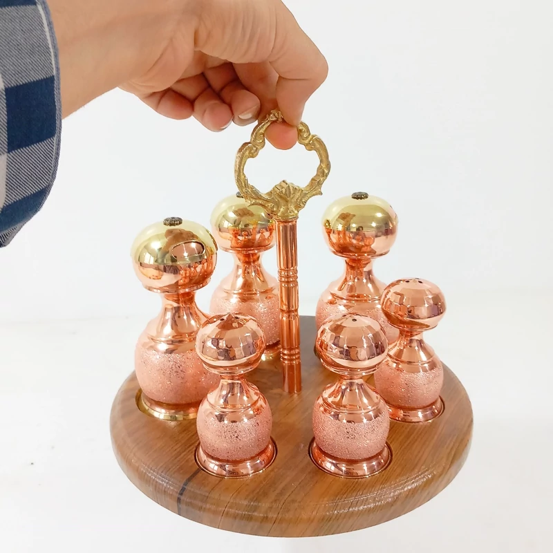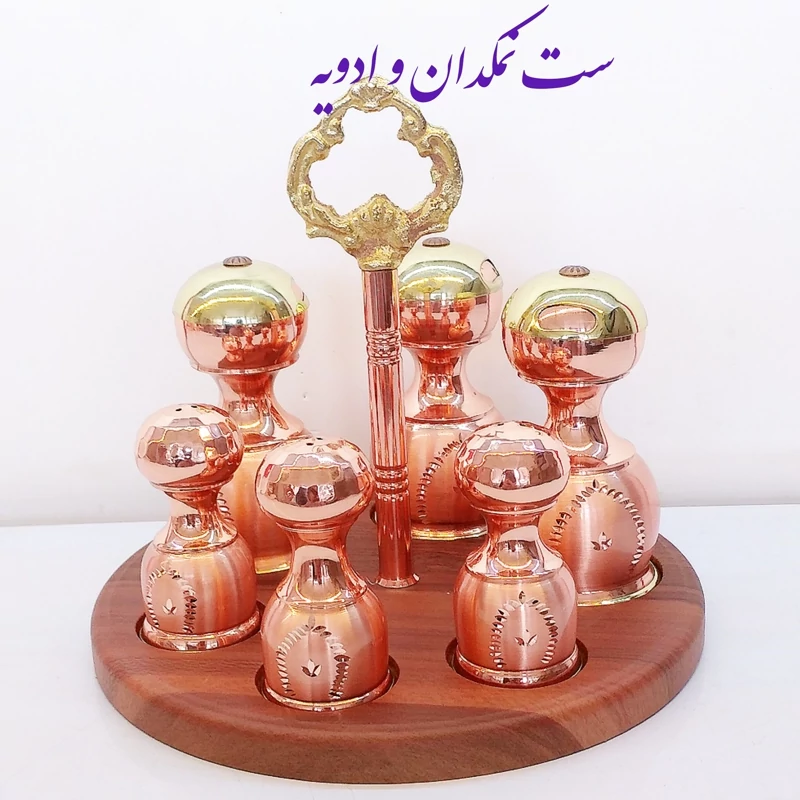 سرویس پاسماوری جا ادویه و نمکدان مسی با استند چوبی