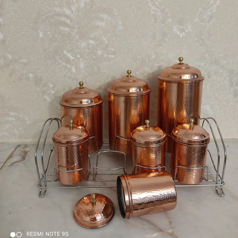 جا ادویه مسی مدل جدید هفت تایی با یک قاشق چوبی با ظرف بزرگ دردار