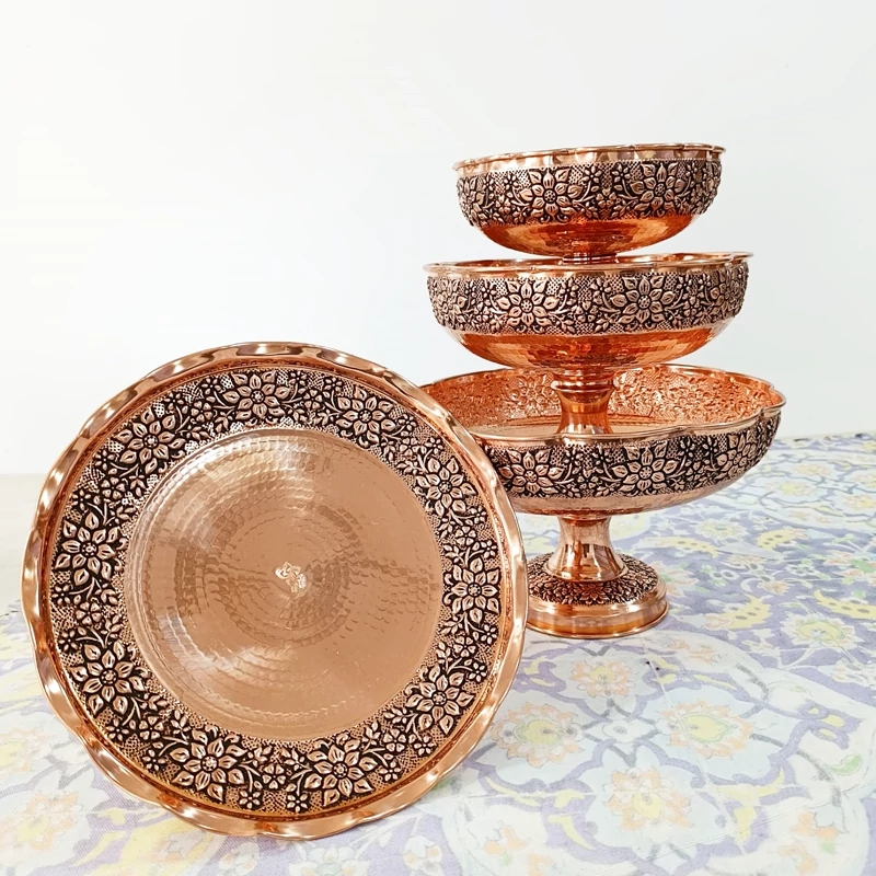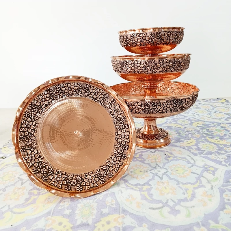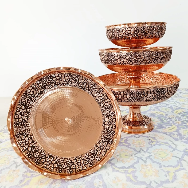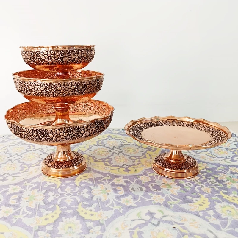 ظروف پذیرایی مسی 4 تیکه دست ساز گل برجسته قلم زنی