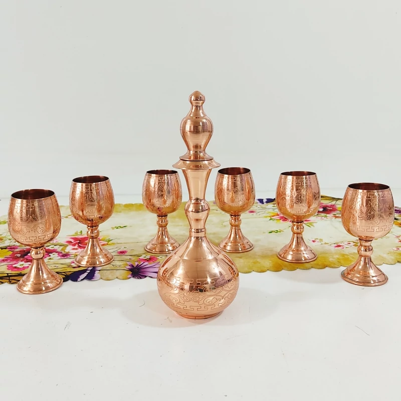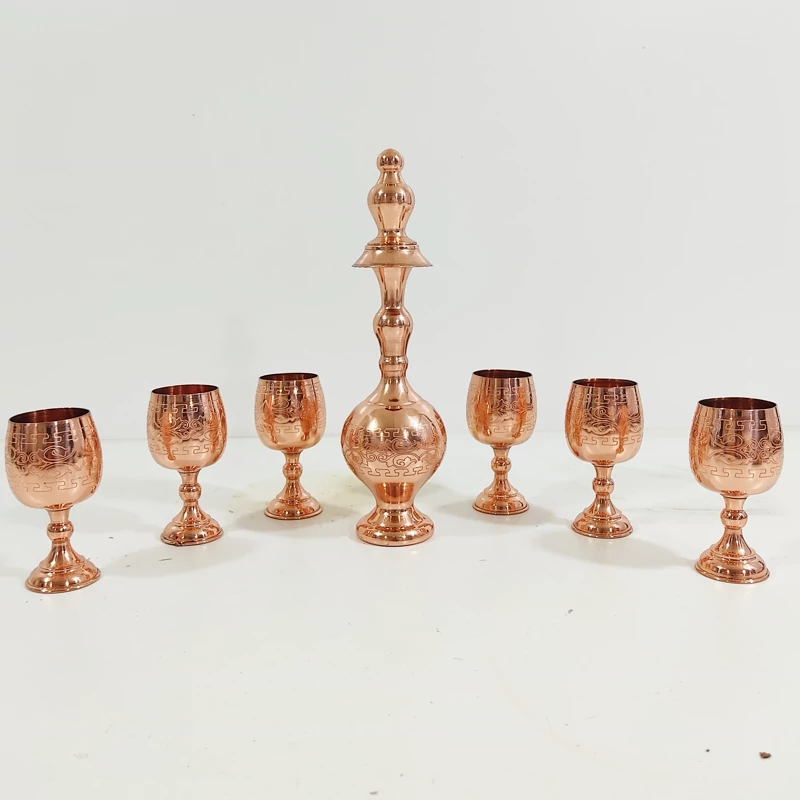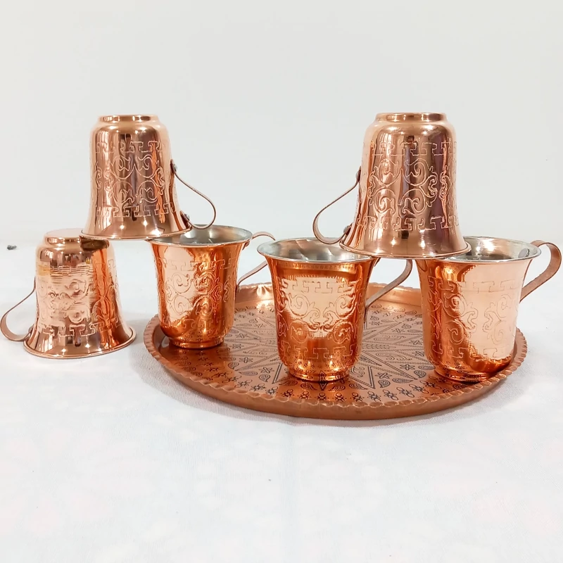 ست تنگ و شش جام مسی دست ساز زنجان رنگ ثابت و طراح دار برای پذیرایی لوکس