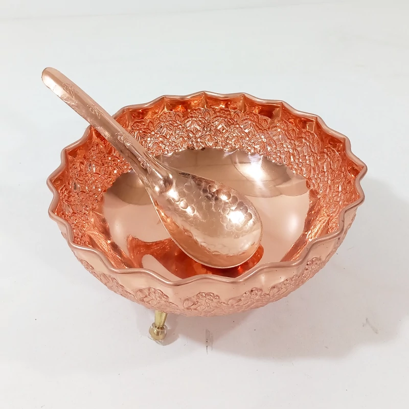 آجیل خوری مسی سه پایه طرح ریزگل برجسته همراه قاشق آجیل