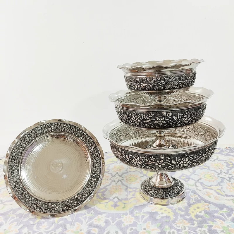 سرویس پذیرایی مسی کروم دست ساز سیاه قلم گل برجسته 4 تیکه