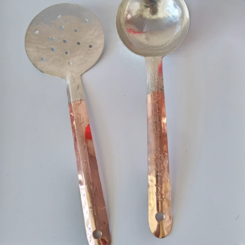 ست کفگیر و ملاقه دورنگ مسی دست ساز ، دسته مسی بدنه قلع شده باهم