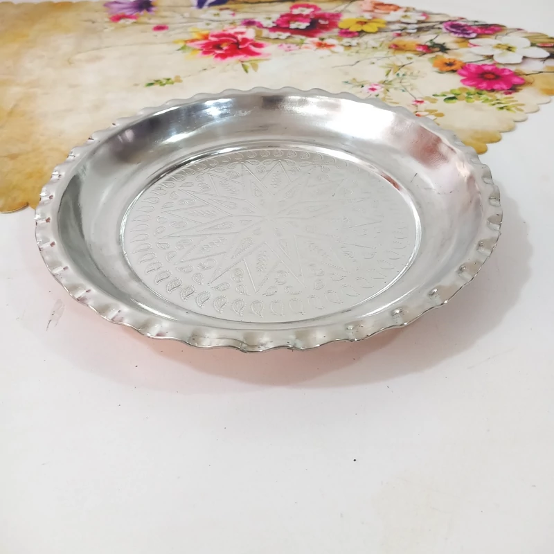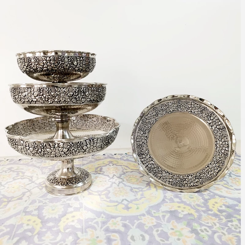 سرویس پذیرایی 3تیکه (غیر از آجیل خوری) مسی کروم شده و نانو شده مدل اطلس گل کاری چکش کاری شده