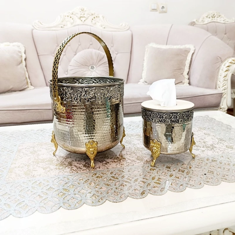 ست جا دستمال کاغذی تمام مسی کروم و سطل زباله جا کلنکسی مسی براق نانو