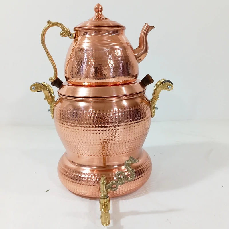 سماور و قوری روگازی شیر دار تمام مس زنجان کاملا دست ساز مدل چکشی و نانو شده رنگ ثابت