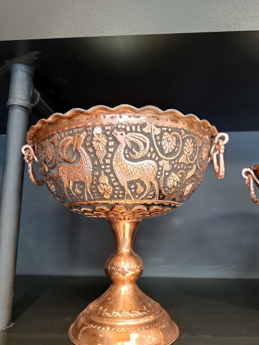 کاسه تک پایه سیاه قلم مسی سایز 2 ارتفاع 19 سانت گوشواره دار
