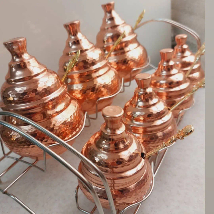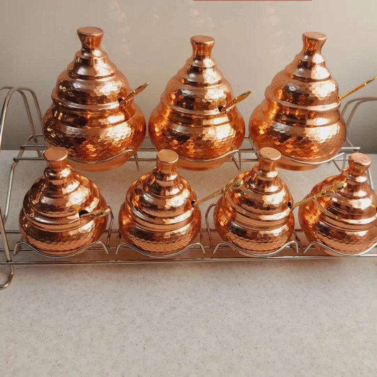 جا ادویه مسی 7 تایی همراه استند سایز بزرگ ارتفاع 20 دهانه 10 سایز کوچک ارتفاع 10.5 دهانه 5.5