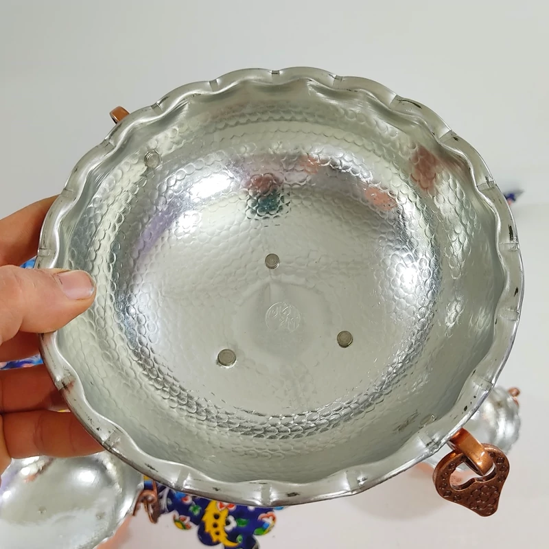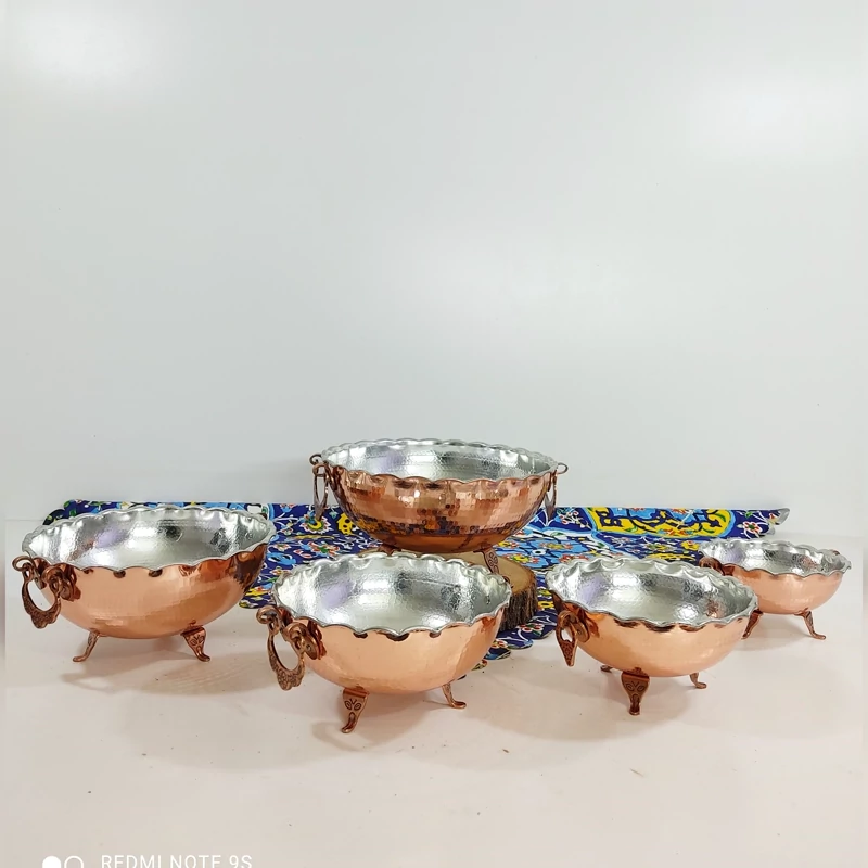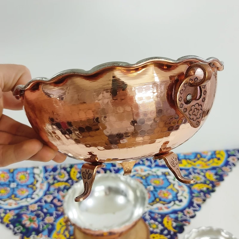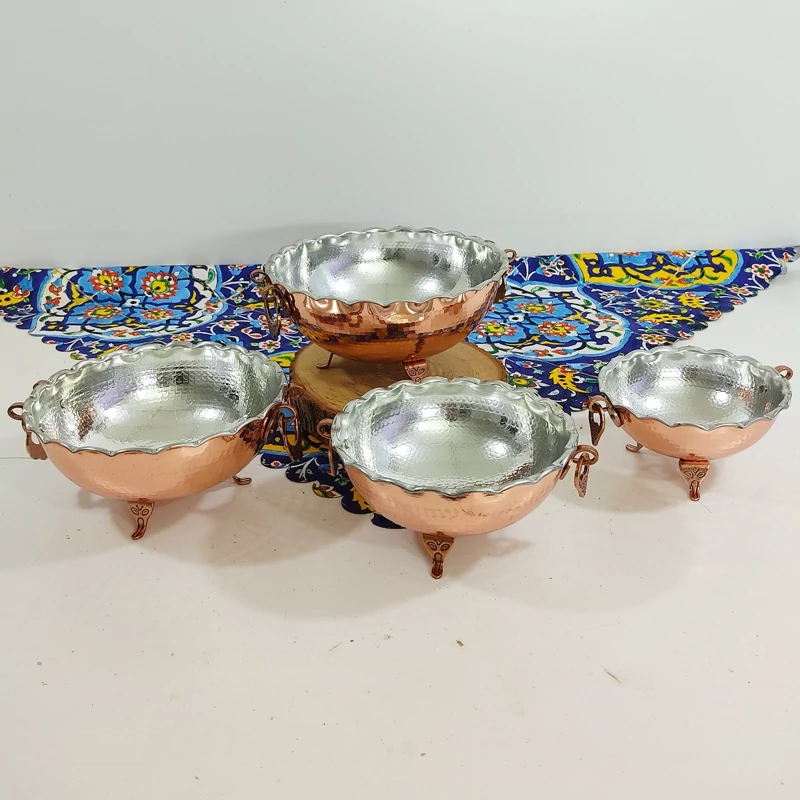 چهار سایز کاسه گوشواره دار تمام مسی زنجان چکش کاری شده داخل قلع مدل سه پایه مناسب میوه شکلات و آجیل خوری و البته سوپ خوری چکش کار بسیار تمیز و درجه یک یک کار زیبا و سنتی