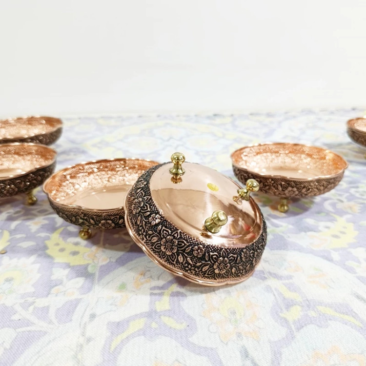 🟤 پیاله مسی سهپایه نانو شده (ست 6 عددی) گل برجسته سیاهقلم