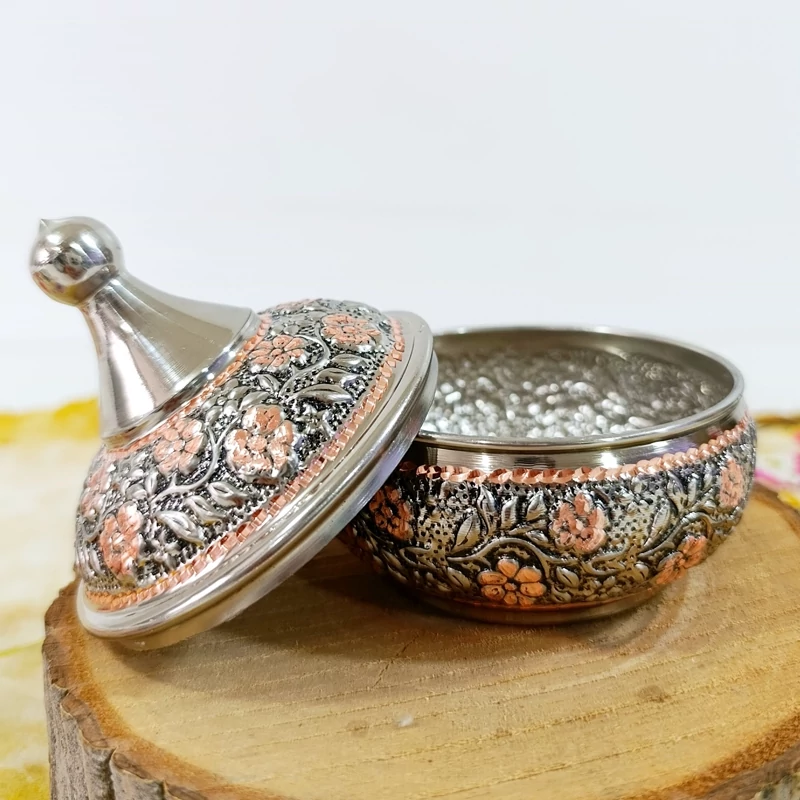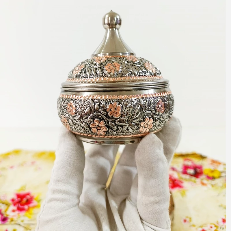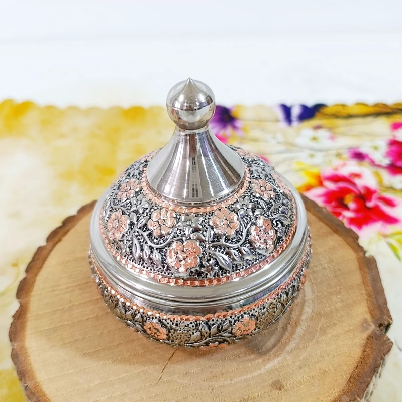 قندان تمام مسی رنگ ثابت طرح برجسته گل و برگ کاری شده سیاه قلم این محصول مسی آبکاری کروم شده به رنگ نقره ای و بعد روی گل ها تراش شده و به رنگ مسی در امده و یک محصول دو رنگ خاص و متفاوت شده
