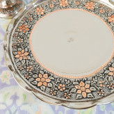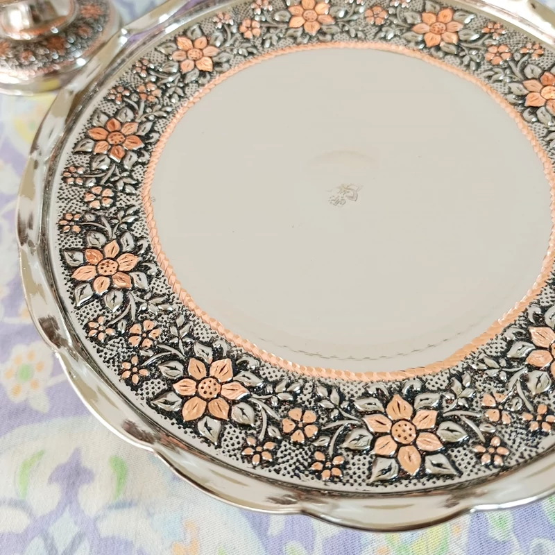 سرویس پذیرایی گل برجسته مسی که آبکاری کروم شده به رنگ نقرهای بعد روی گل های محصول تراش شده که به صورت دو رنگ شده