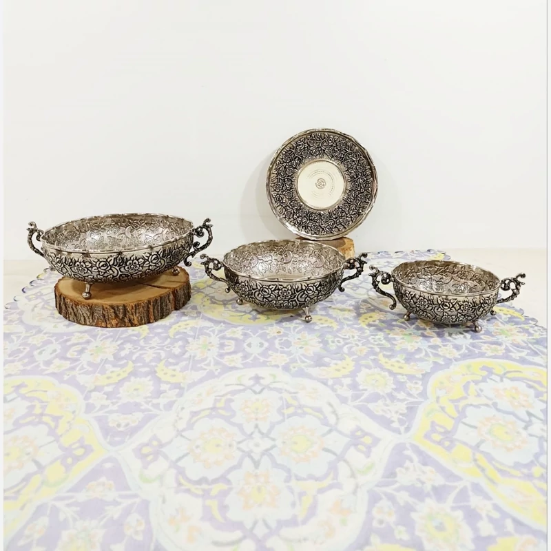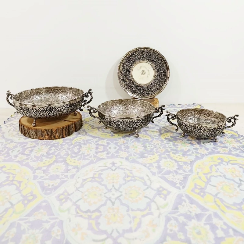 شامل میوه خوری آجیل خوری شکلات خوری و شیرینی خوری همگی بدنه و پایه ها مس خالض ضخیم و شفاف زنجان