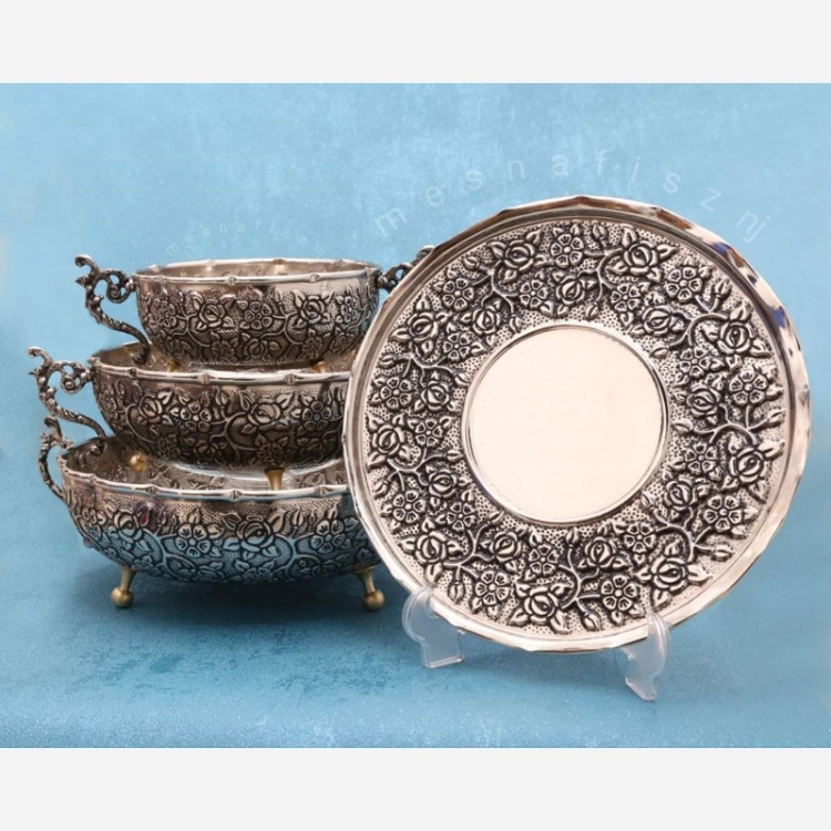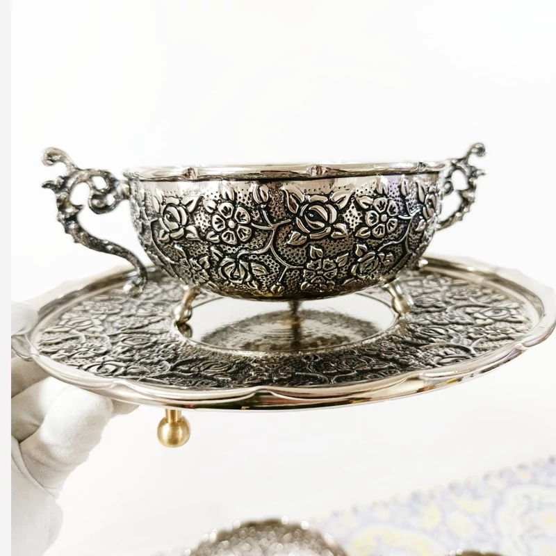 سرویس پذیرایی مسی سه پایه دسته دار سلطنتی کروم و نانو شده چهار تیکه زنجان طرح گل برجسته