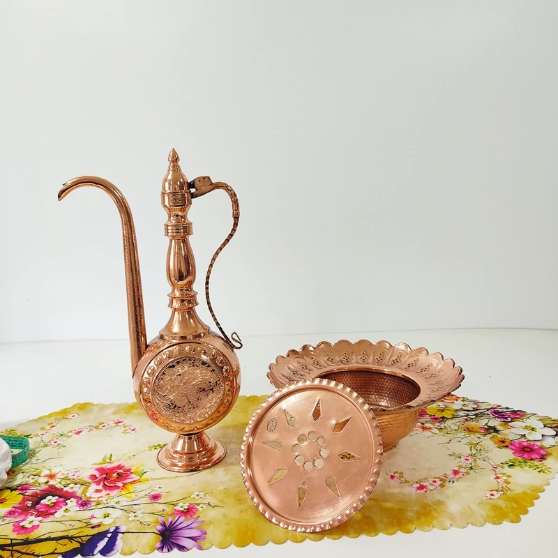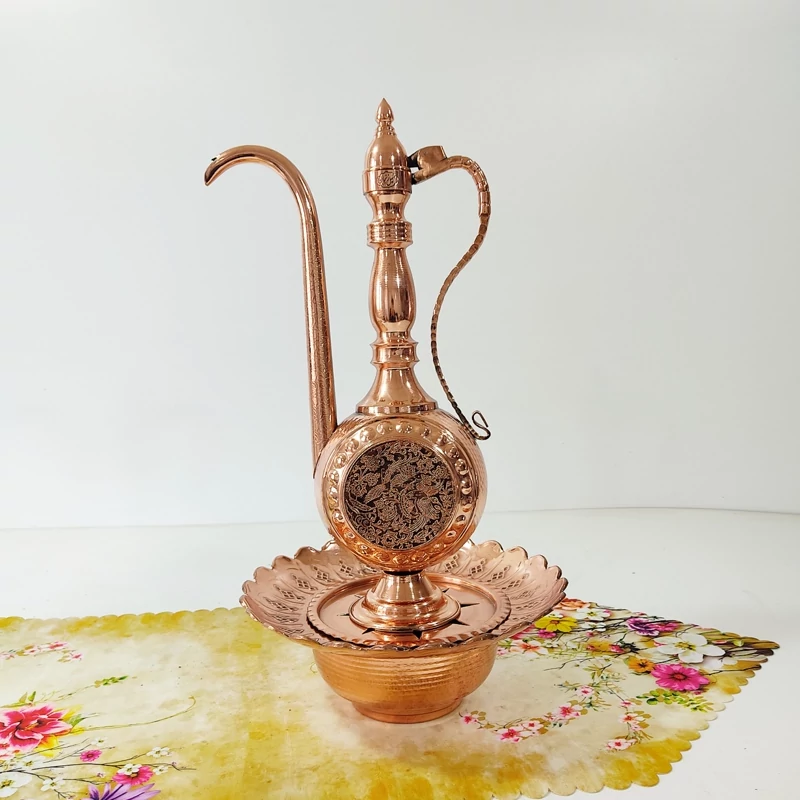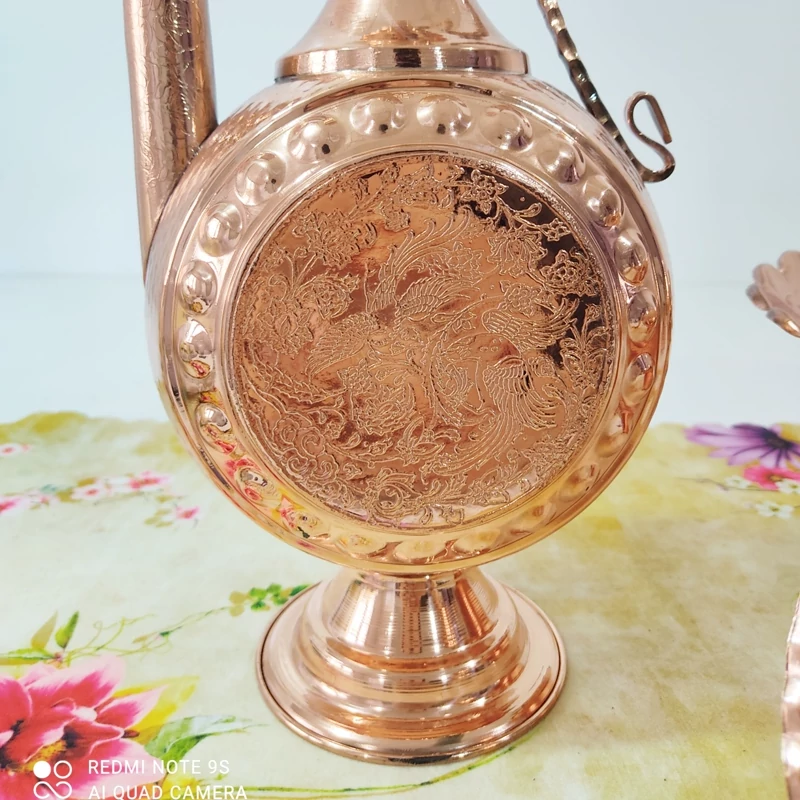آفتابه لگن مسی زنجان رنگ ثابت و نانو شده با طرح برجسته روی توپی و لوله دقت کنید ممکنه طرح ارسالی دقیقا طرح عکس نباشه و طرح ها مختلفن درب لولایی ارتفاع افتابه روی لگن باهم ۵۲ ارتفاع آفتابه تک۴۴ سانت