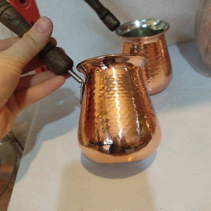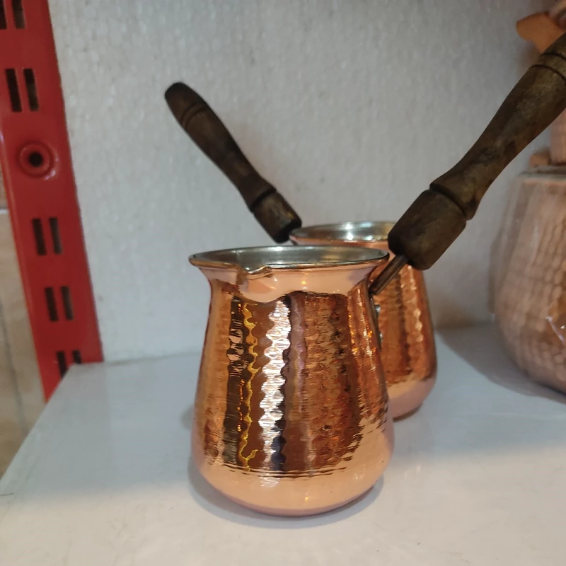 قهوه جوش چکشی ضخیم مناسب قهوه و سیسمونی برای شیر داغ کردن نانو شده رنگ ثابت تمام مس دسته چوبی سایز متوسط گنجایش حدودا 4کاپ