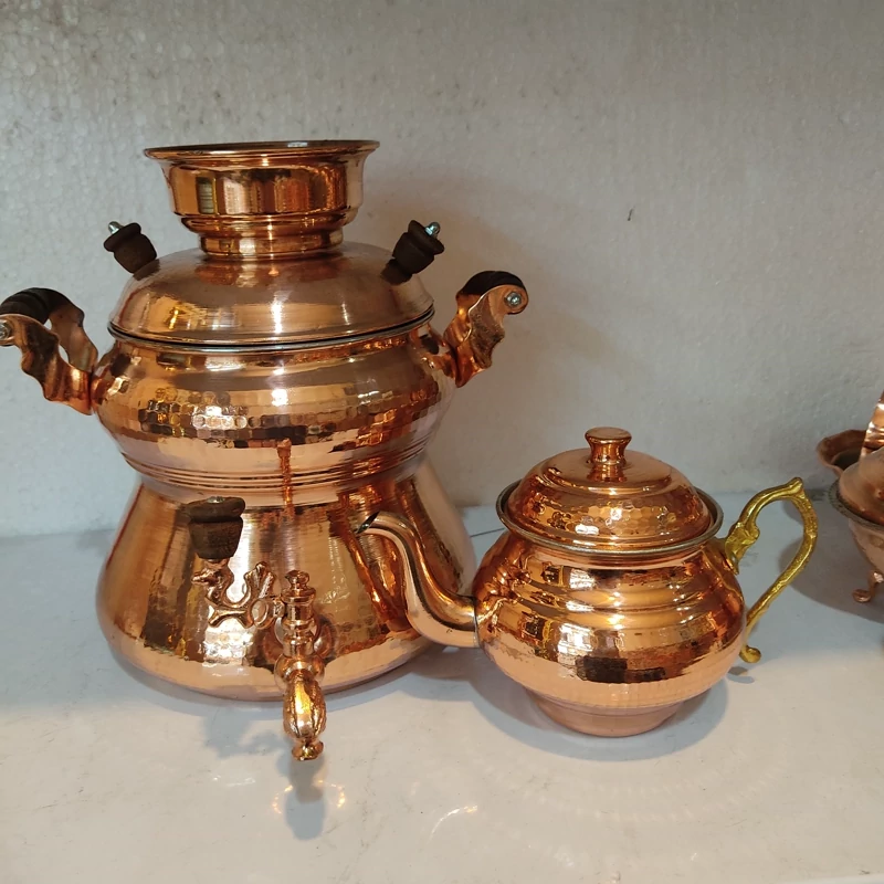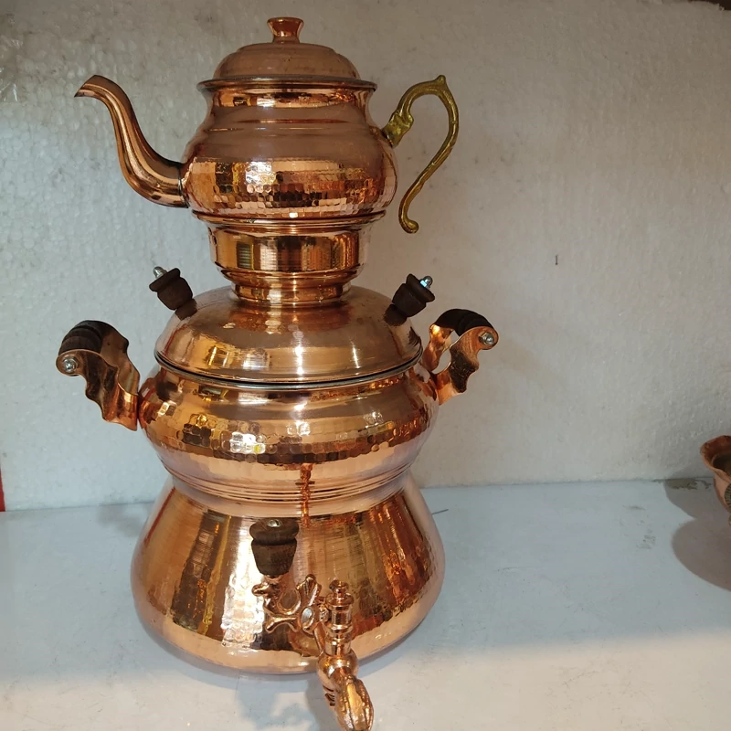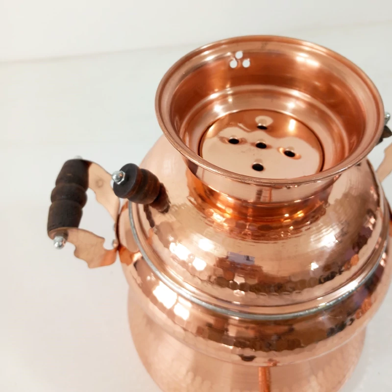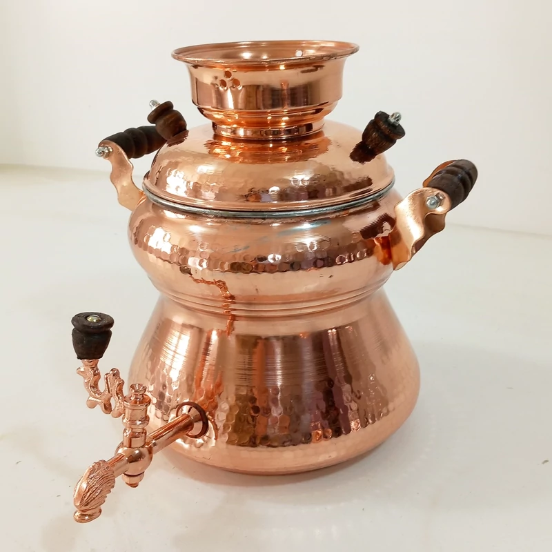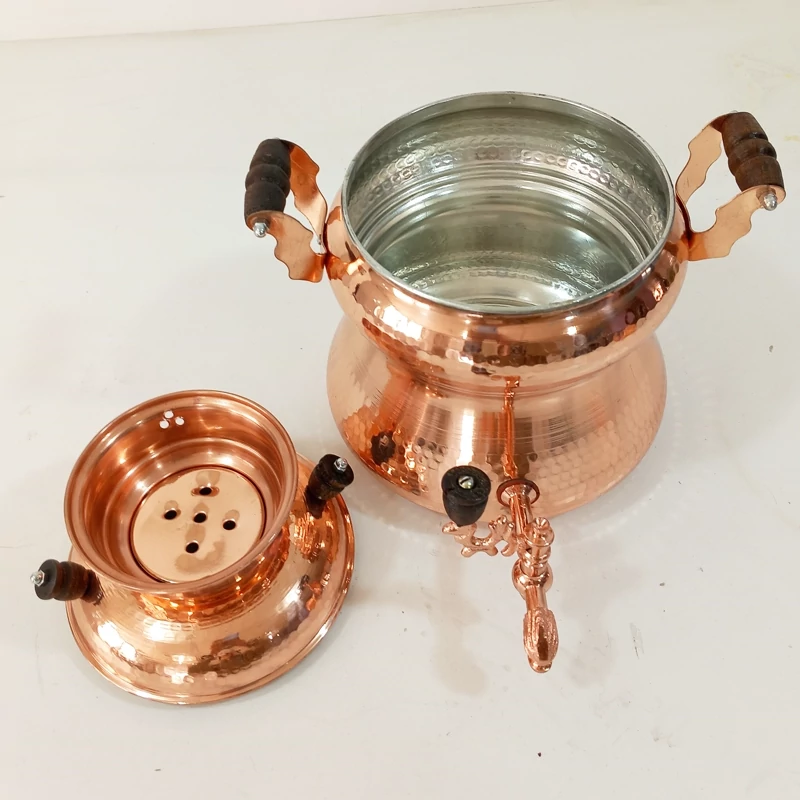 سماور یا کتری روگازی مسی زنجان کاملا دست ساز چکش کاری شده و داخل قلع کاری شده رنگ ثابت نانو شده حجم حدودا 3/5لیتری ارتفاع 25 سانتیمتر قطر دهانه 15 سانتی متر