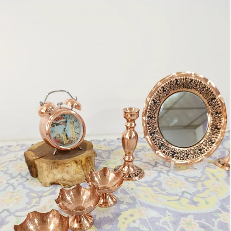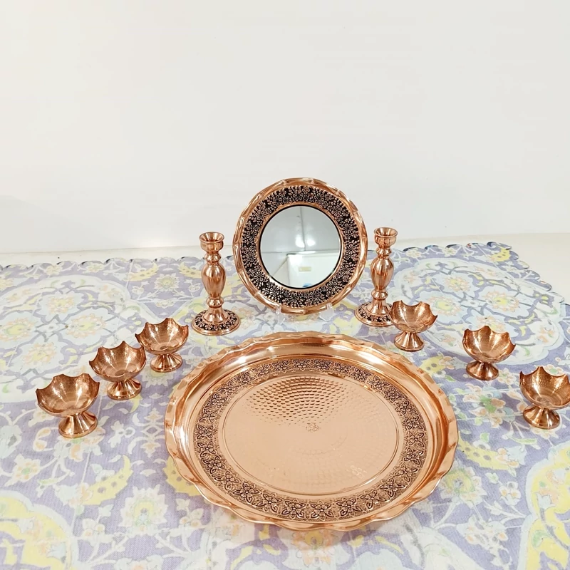 ست هفتسین مسی هماهنگ با این آیینه و شمعدان نیز در غرفه موجود است.