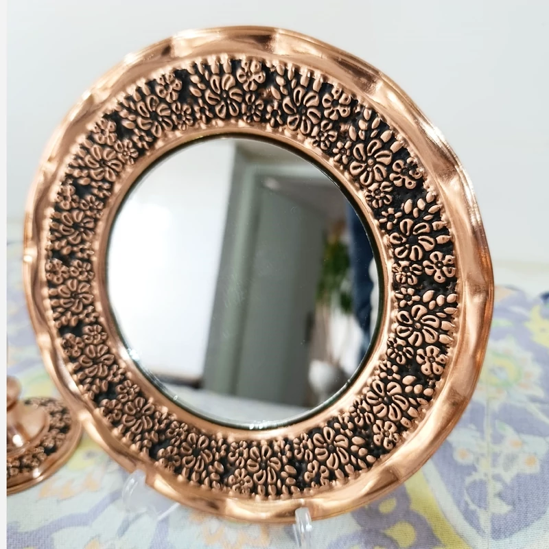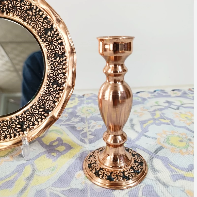 دور تا دور قاب آیینه و پایه شمعدانها با گلهای برجسته دستکار تزئین شده و با پرداخت ظریف، زیبایی چشمنوازی ایجاد کرده است. استفاده از پوشش رنگ ثابت (نانو) باعث شده این محصول در برابر تغییر رنگ مقاوم باشد و سالها بدرخشد.