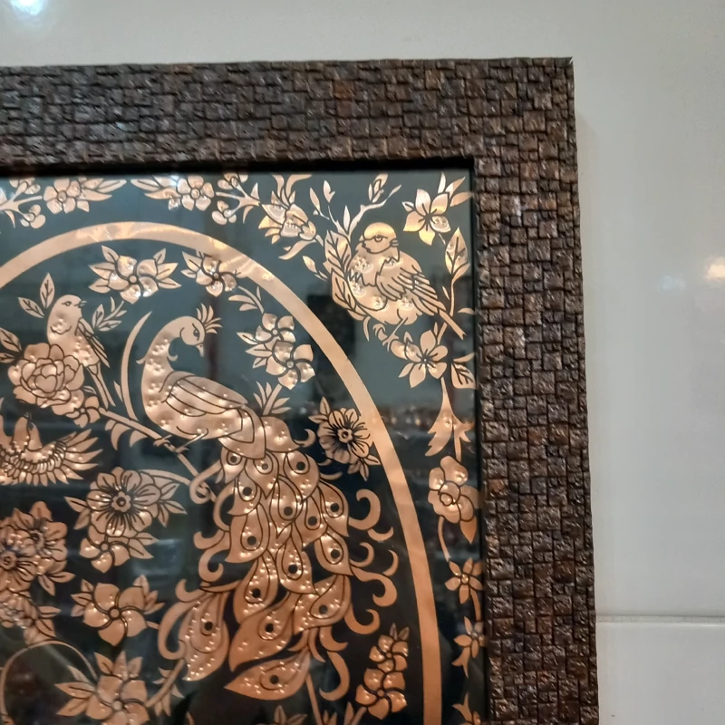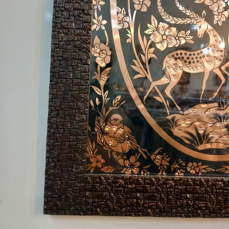 تابلو مسی دیوار کوب طرح شکار گاه مستطیلی طرح چاپی روی ورقه ی مسی مناسب هدیه و کادو ارسال رایگان با قاب زیبا دور با طرح گل بسیار چشم نواز روی کار شیشه ابعاد طول ۴۷ عرض ۳۴