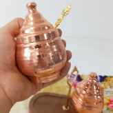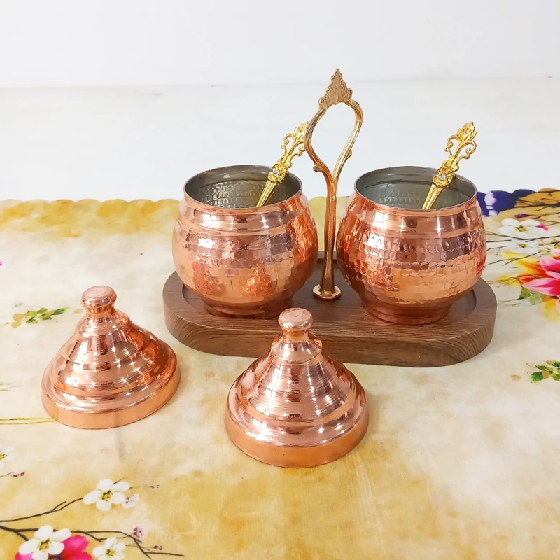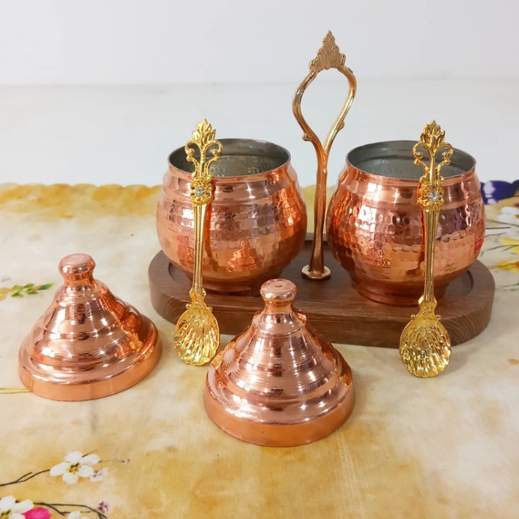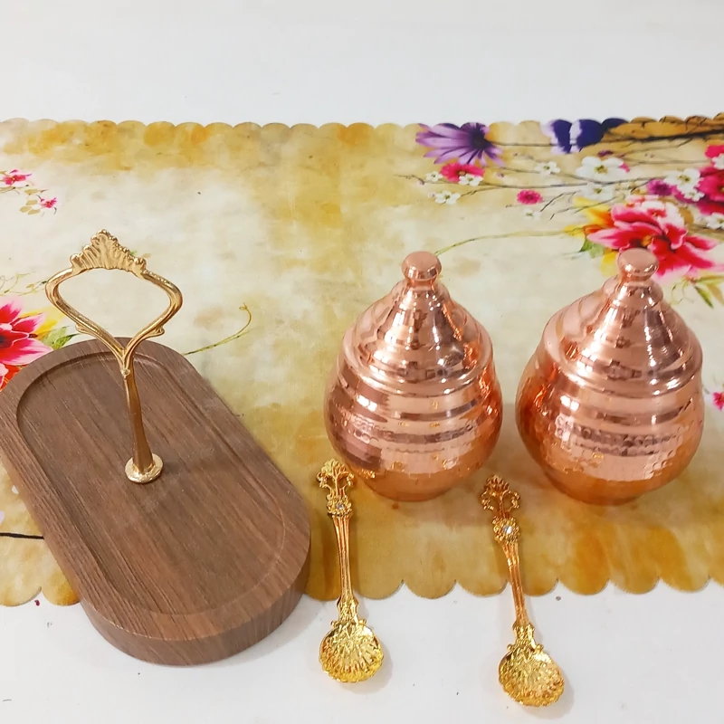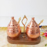 مربا خوری مسی دوتایی قاشق دار با استند چوبی همچنین مناسب ادویه
