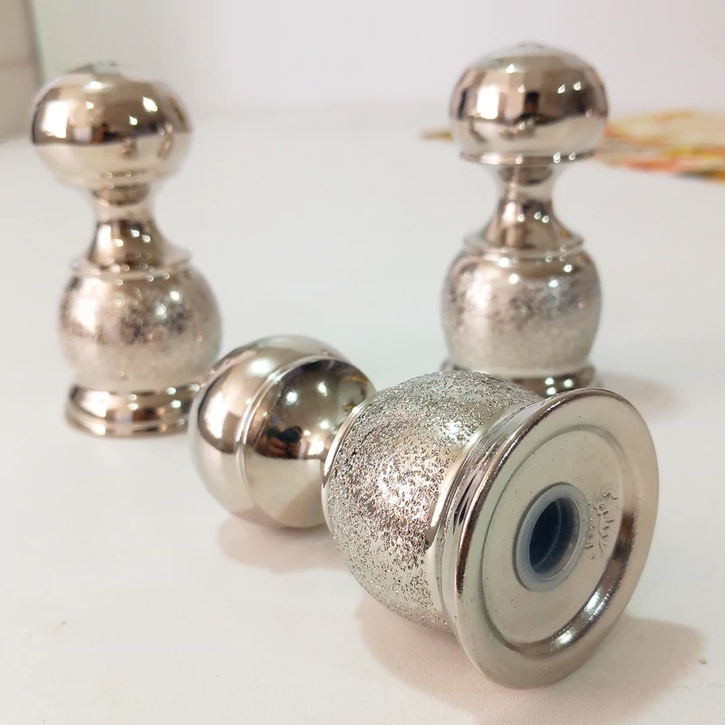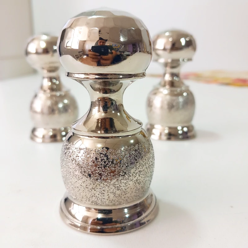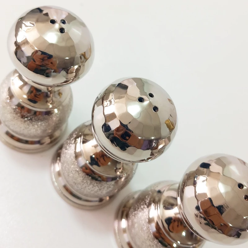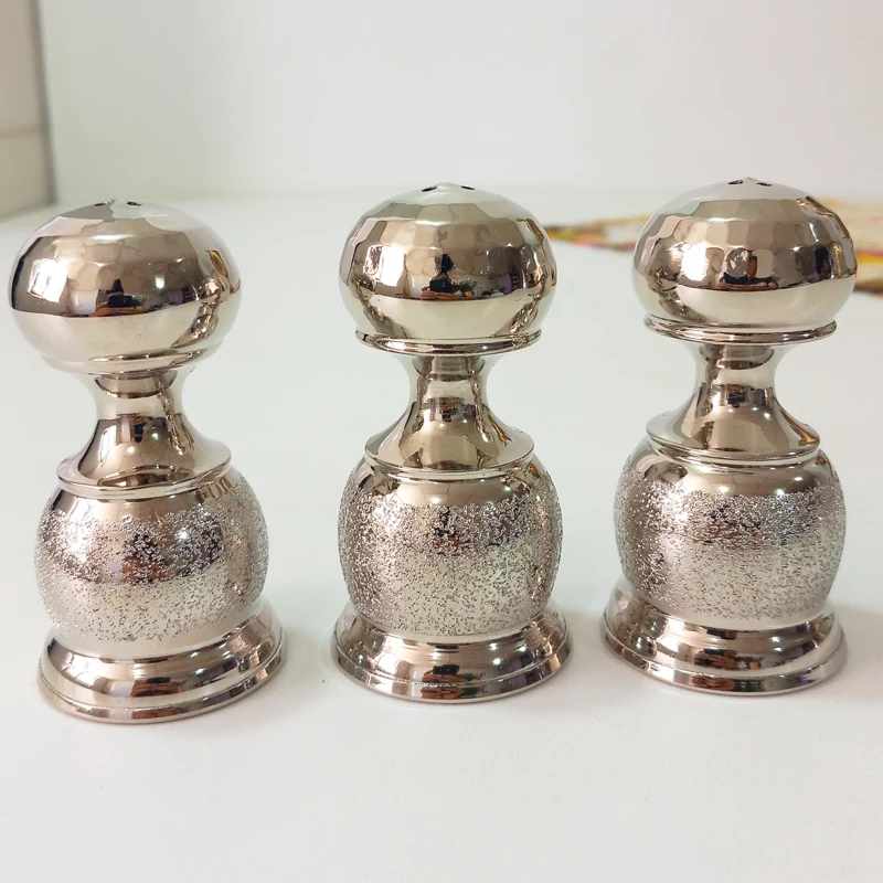 نمکدان کمر باریک برند مصطفوی طرح شنی بالای کار چکش کاری شده دارای سه سوراخ با آبکاری کروم رنگ ثابت درپوش پلاستیکی