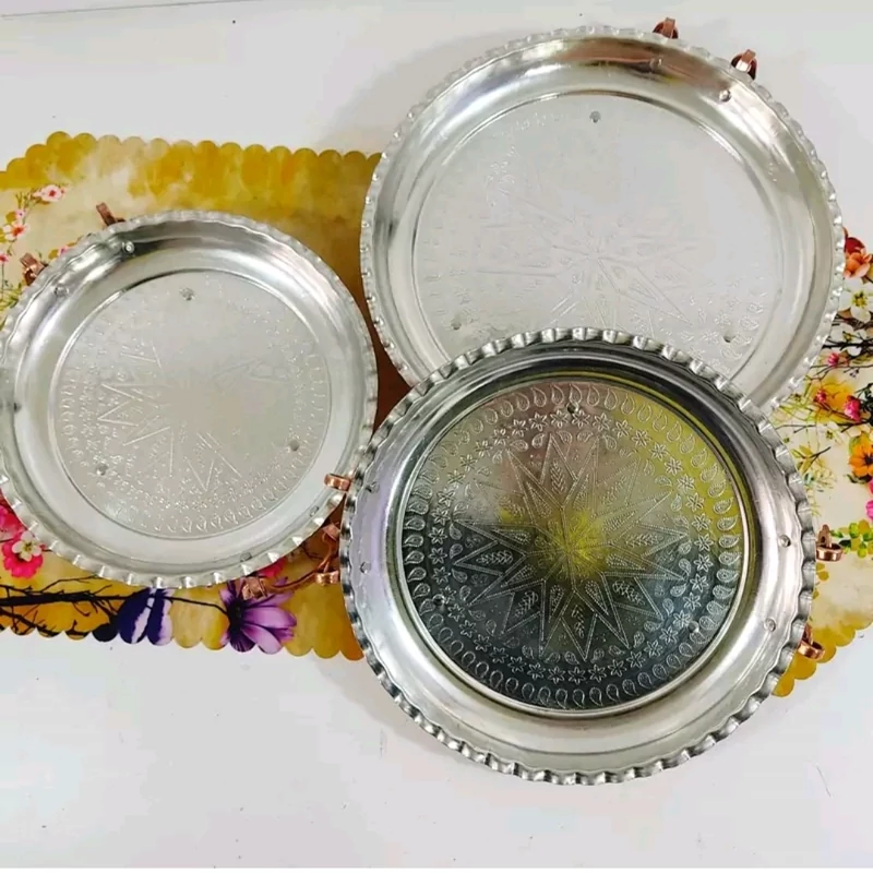مجمع سینی سه عددی در سه سایز پایه دار و دسته دار داخل قلع بیرون نانو شده مناسب پلو سالاد مرغ شیرینی کیک و هر چیز دیگر با طرح برجسته زیبا