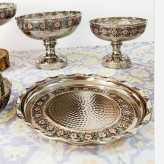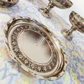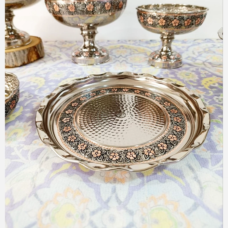 سینی تمام مس زنجان کروم تراش نانو شده بسیار ضخیم قطر28 گل برجسته سیاه قلم چکشی کار دست زیبا ارسال رایگان