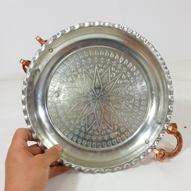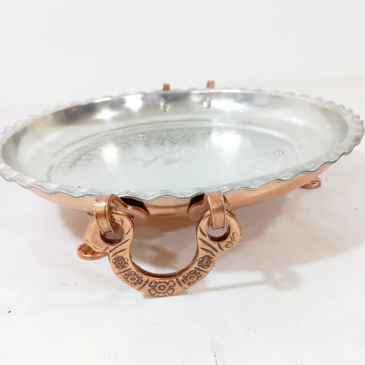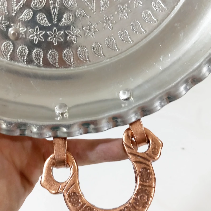 دسته و پایه دار زنجان که دسته و پایه از جنس مس و داخل سینی طرح برجسته است