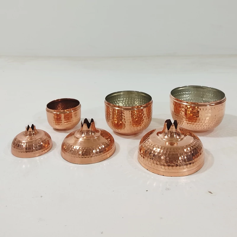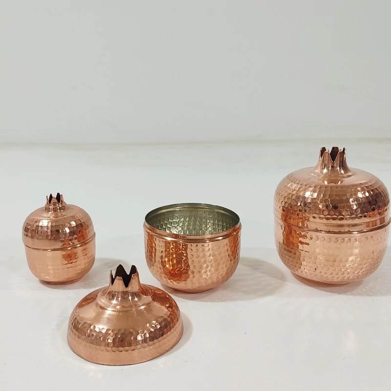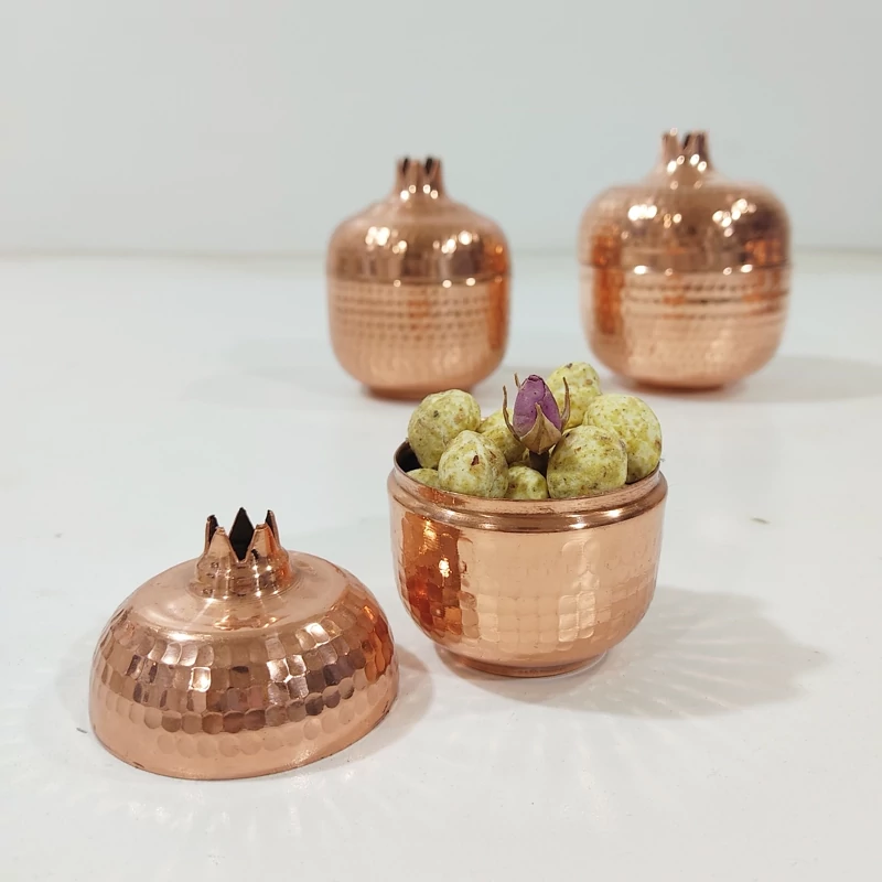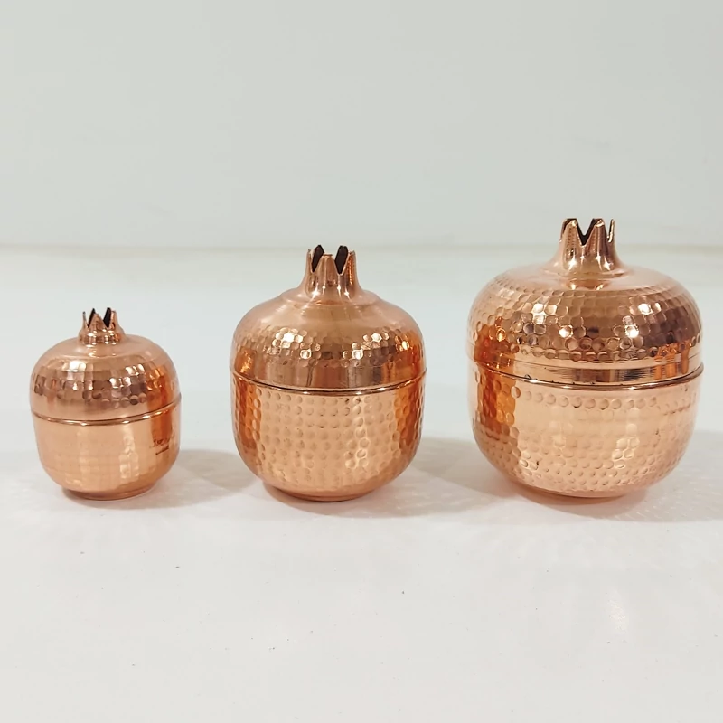 سه سایز قندان انار مسی دست ساز زنجاننانو شده و رنگ ثابت با قطر های ۵/۵ ۷/۵ ۹سانت داخل قلع کاری شده مناسب تنقلات و قندان برای شب یلدا و ...