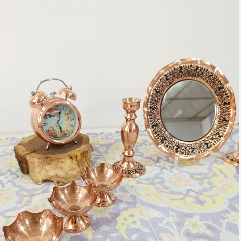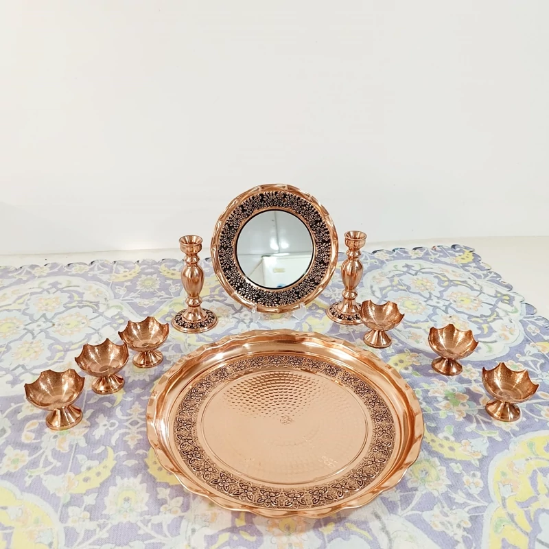 ست هفتسین مسی هماهنگ با این آیینه و شمعدان نیز در غرفه موجود است.