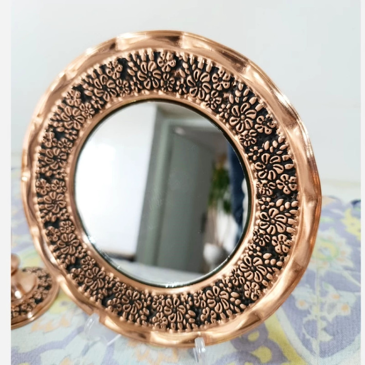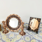 دور تا دور قاب آیینه و پایه شمعدانها با گلهای برجسته دستکار تزئین شده و با پرداخت ظریف، زیبایی چشمنوازی ایجاد کرده است. استفاده از پوشش رنگ ثابت (نانو) باعث شده این محصول در برابر تغییر رنگ مقاوم باشد و سالها بدرخشد.