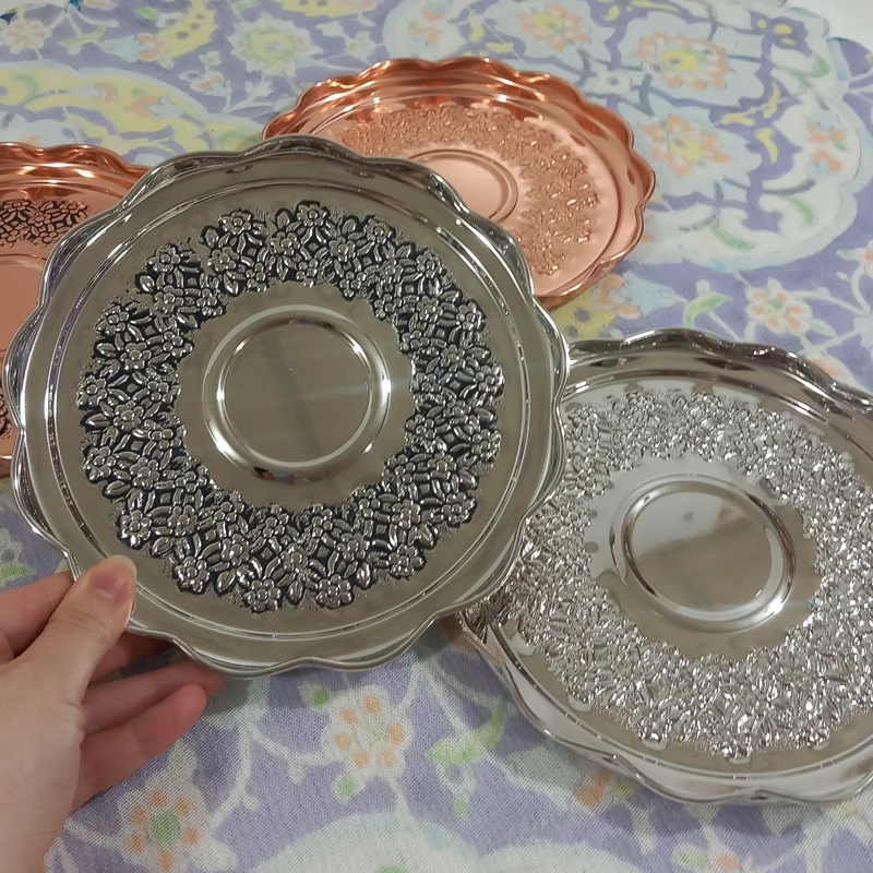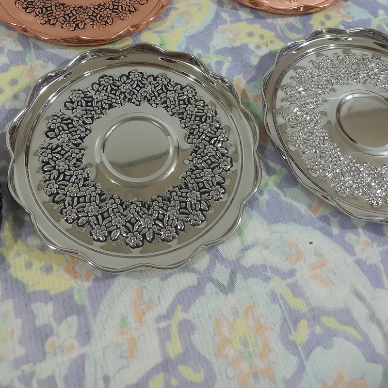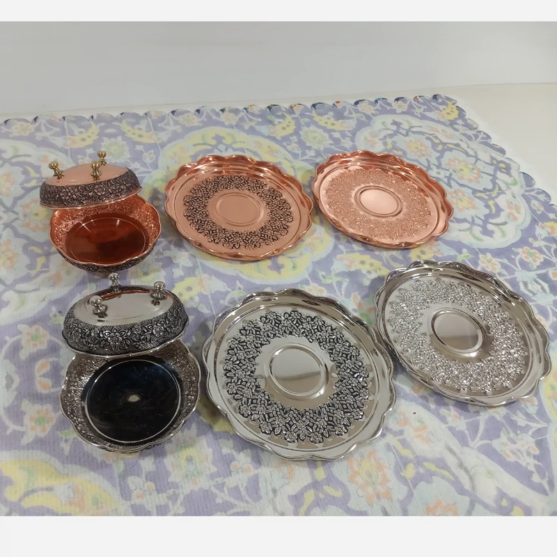 پیش دستی تمام مسی زنجان کروم شده بسته شش تایی نانو شده رنگ ثابت رز مس درجه یک اعلا قلم شده رنگ ثابت کار بسیار زیبا و شیک قطر 19 سانتیمتر ارسال رایگان