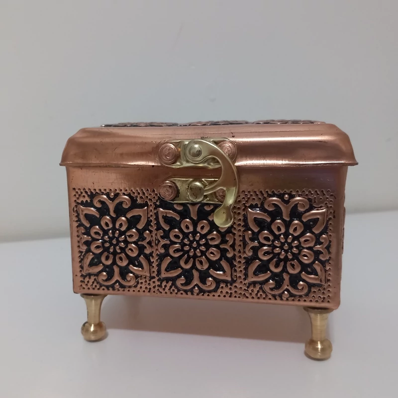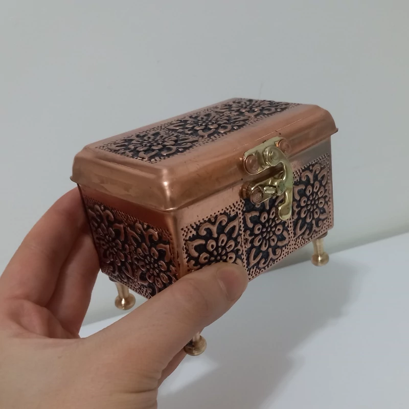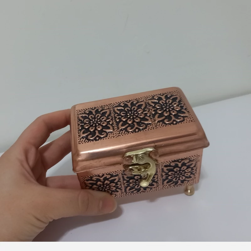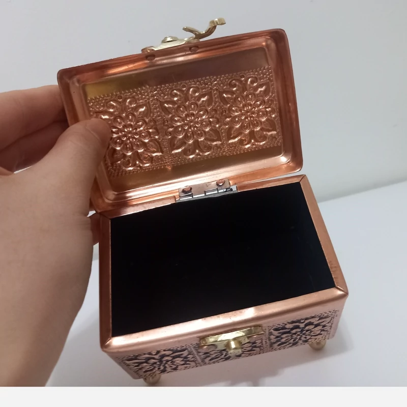 جعبه جواهر تمام مس زیبا گلبرگ کار شیک مناسب برای هدیه دادن و دکوری جعبه جواهر طول 10 عرض 7 ارتفاع 8 جا جواهری گلبرگ زیبا و جذاب ارسال رایگان پایه های کار برنج