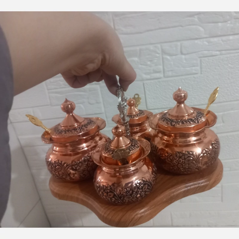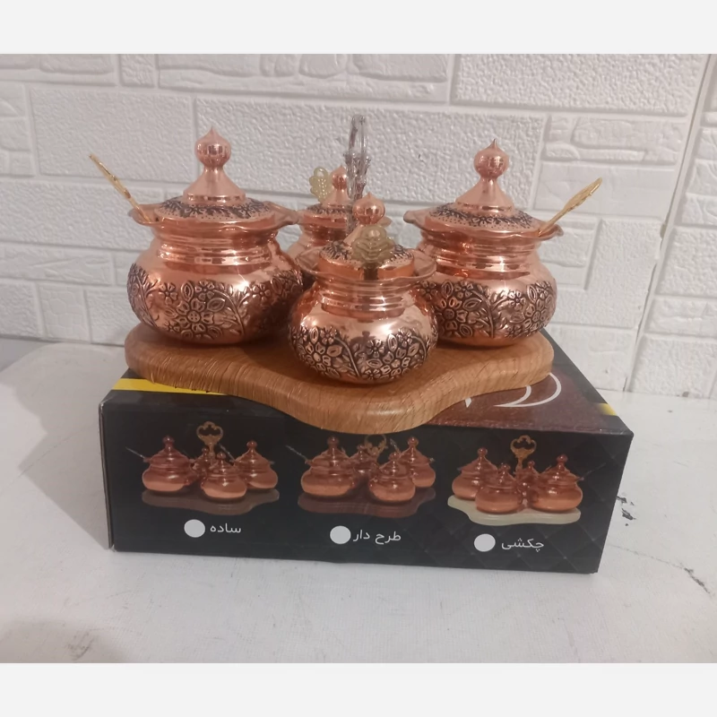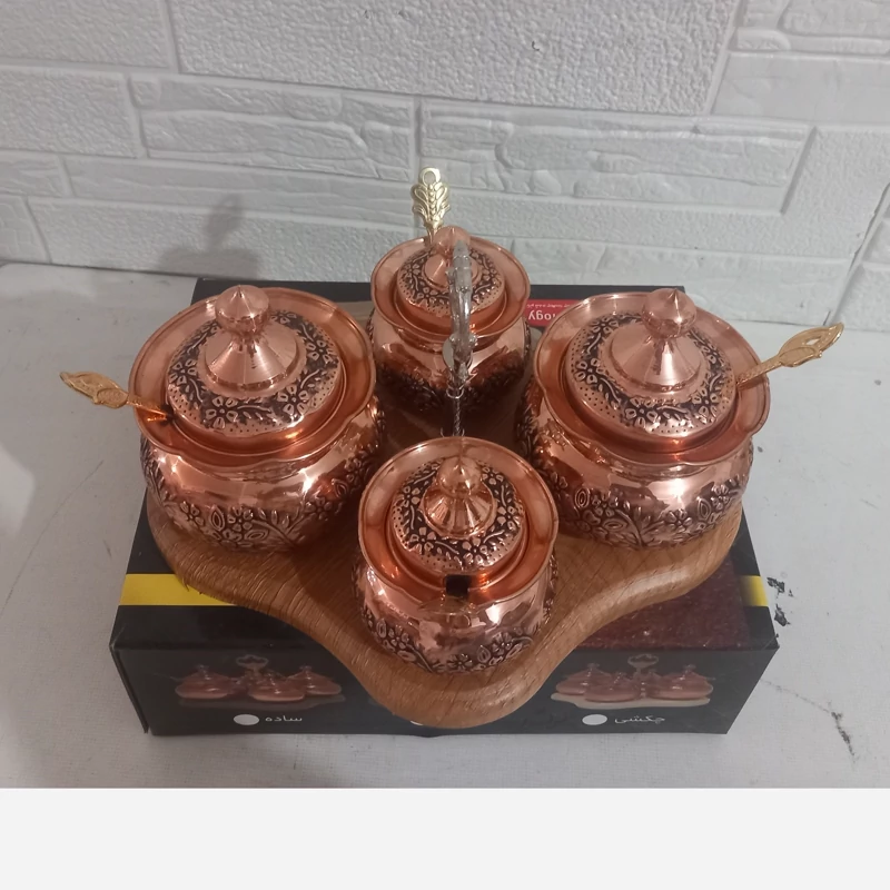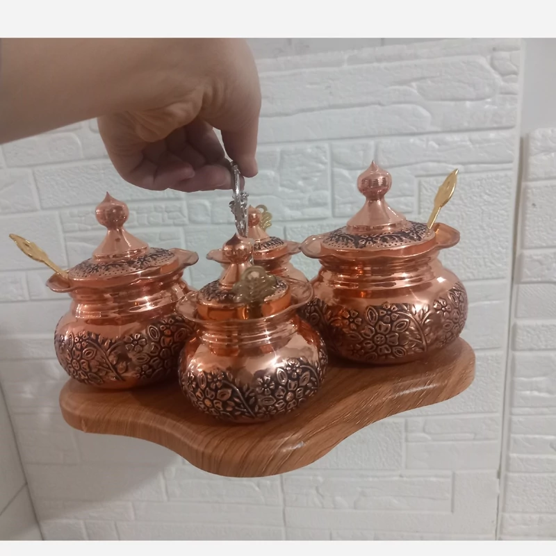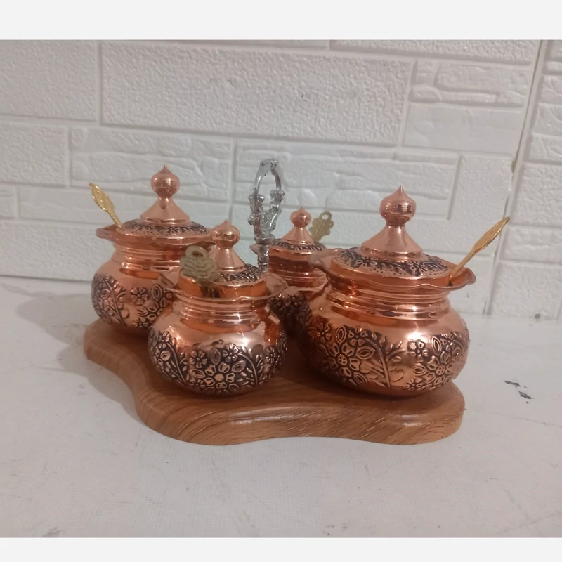جا ادویه یا پاسماوری 4تایی مسی گلبرگ دوسایز بزرگ و دوسایز کوچک میباشد همراه استند چوبی و قاشق نانو شده رنگ ثابت ارسال رایگان ❌️دوستان دسته وسط استند مطابق عکس ها ممکن هست طلایی یا نقره ای،و رنگ استند تیره یا روشن باشد.انتخابی نمیباشد.