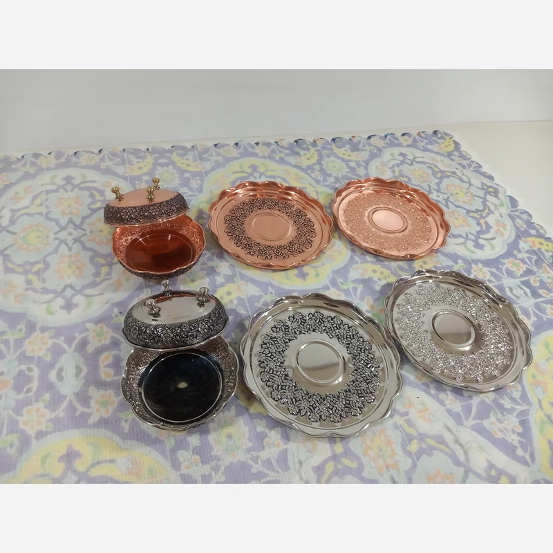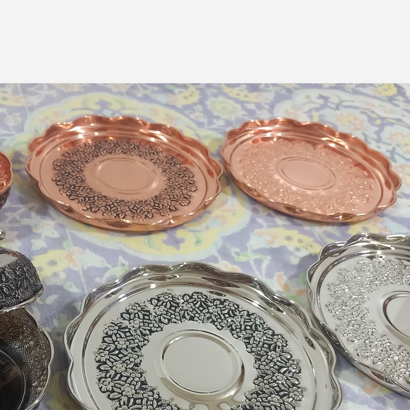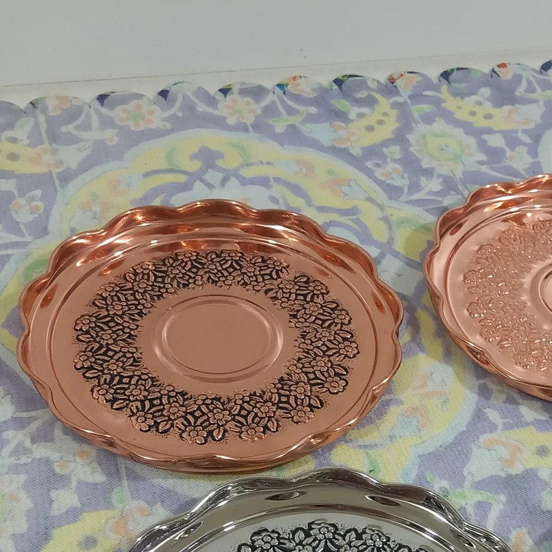 پیش دستی تمام مسی زنجان بسته شش تایی رز مس قلم زیبا رنگ ثابت و نانو شده عالی برای پذیرایی مهمانی،جهیزیه و... قطر 19 سانتیمتر گل های زیبای برجسته رز قلم شده که کار را بسیار شیک و زیبا کرده کار نانو شده رنگ ثابت ارسال رایگان