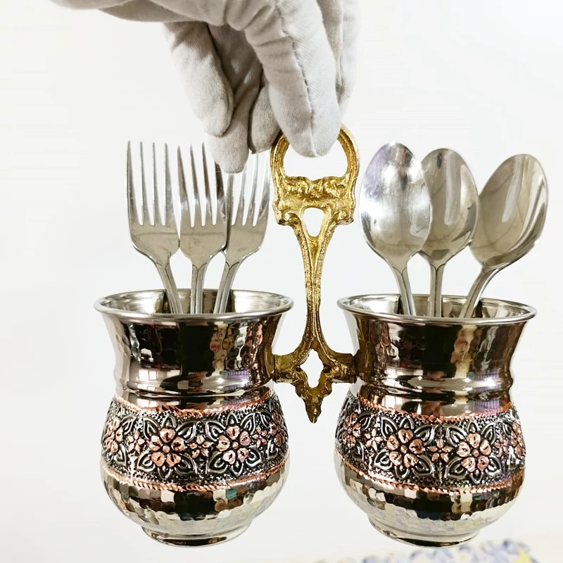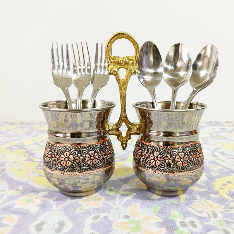 بدنه این جاقاشقی از مس خالص ساخته شده و روی آن گلهای برجسته با هنر سیاهقلمکاری سنتی اجرا شده است. سپس کل کار آبکاری کروم با رنگ نقرهای ثابت شده و در مرحله نهایی، گلها با دست تراش خوردهاند تا ترکیب چشمنواز دو رنگ مسی و نقرهای بهصورت کاملاً طبیعی و هنری نمایان شود.