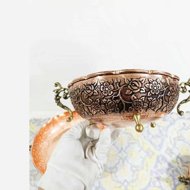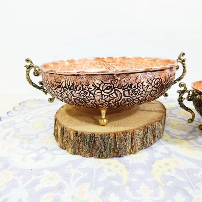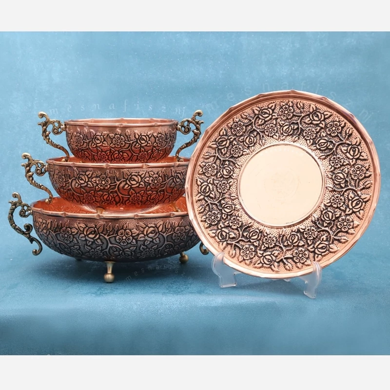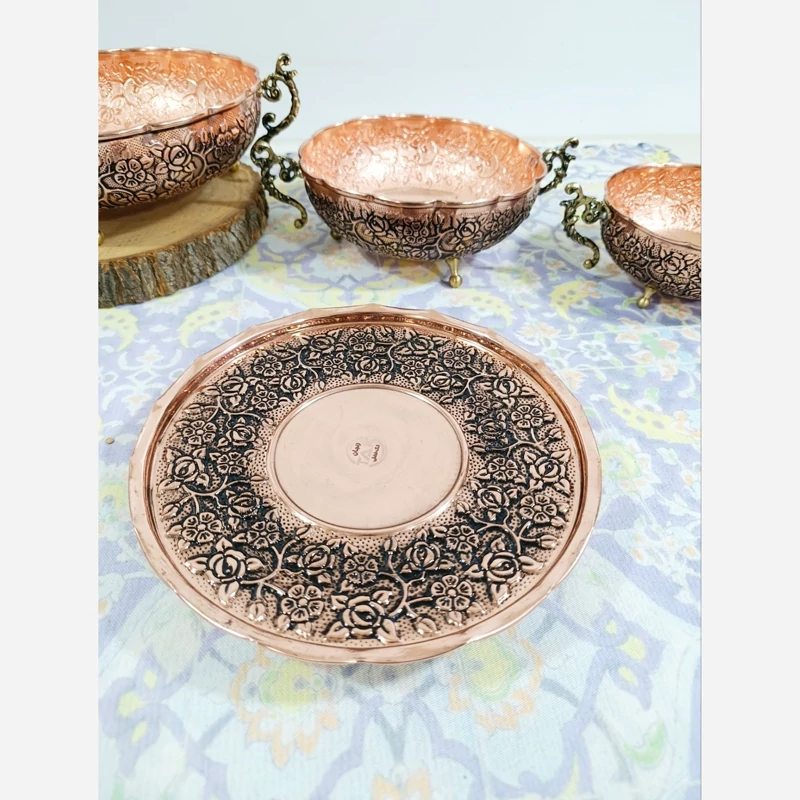 سرویس پذیرایی 4 تیکه مسی کار بسیار جدید و شیک عالی برای جهیزیه فوق العاده زیبا با پایه های طلایی برنجی گل کاری های قلم نقشینه که کار فوق العاده زیبا کرده مناسب تازه عرس ها و کسایی که دنبال کار خاصن به قیمت تولیدی نانو شده رنگ ثابت ارسال رایگان