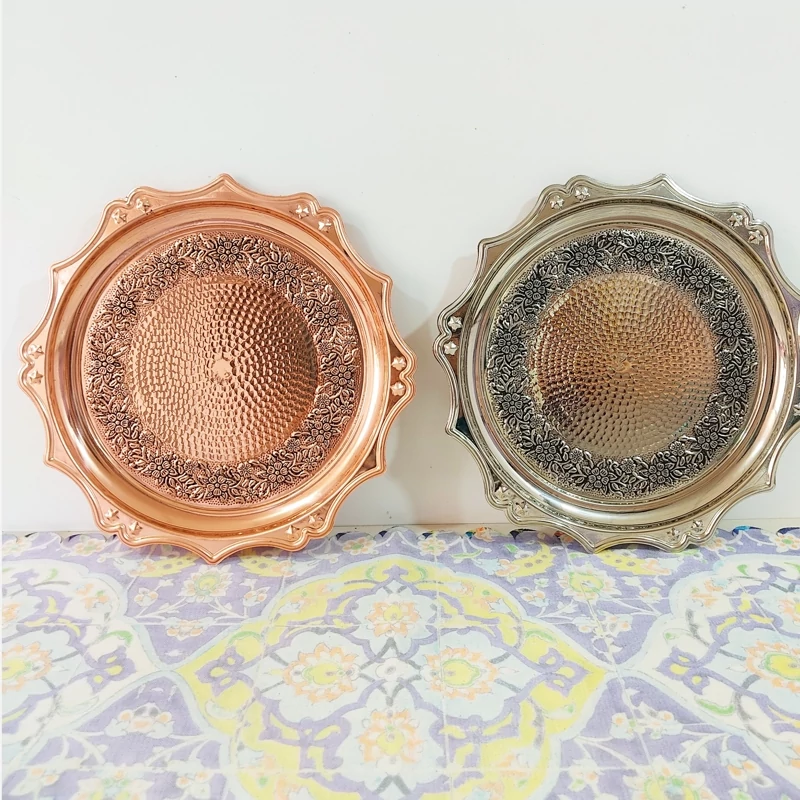 سلام خانمای گل سینی تمام مس گلبرگ چکشی خورشیدی جدید اوردم براتون که میتونید از تولیدی خرید کنید با این قیمت مناسب و کیفیت عالی خودم یکی از اینا ورداشتم نگم از براقیت و کیفیت کار براتون نانو شده تغییر رنگ نمیده تضمینی قطر کار 32