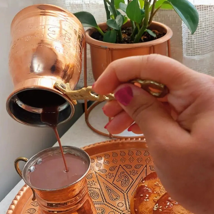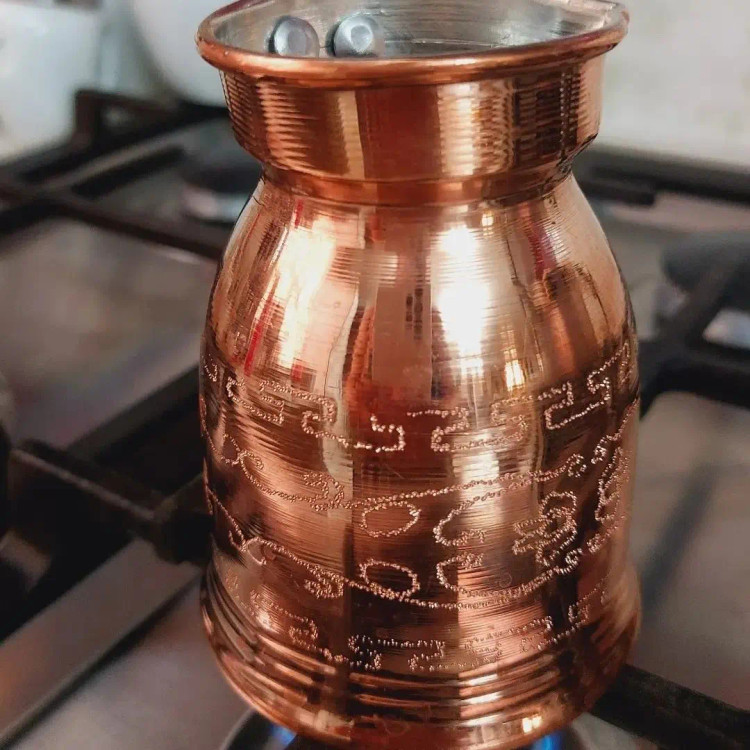 قهوه جوش دسته برنجی ارتفاع ۹.۵ دهانه ۵.۵ سانت حجم ۵ کاپ مناسب شسرجوش و قهوه جوش
