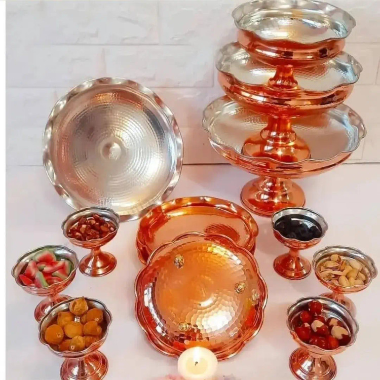 ست نوروزی مس سرای نمونه شمال ست ۴ تیکه دیبا کاسه ای شامل میوه خوری شیرنی خوری آحیل خوری و شکلات خو ی.۶ عدد پیش دستی ۳پایه.۶عدد بستنی خوری