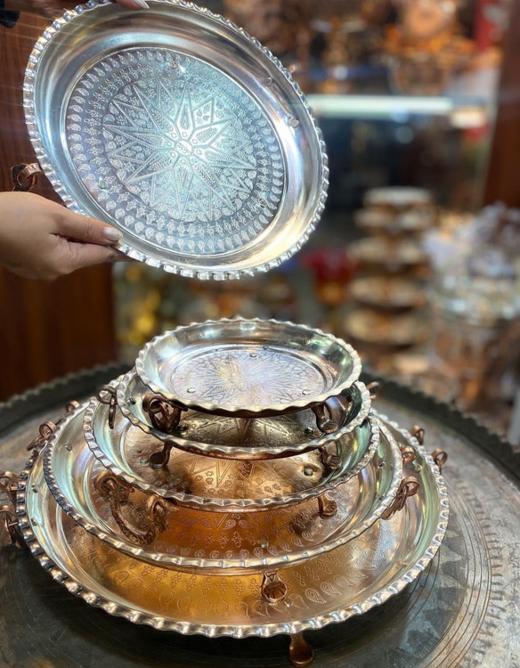 سینی مسی سه پایه گرد سایز 3 قطر 31 سانت.سه پایه گوشواره دار طرحدار