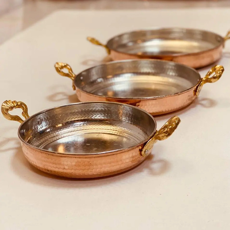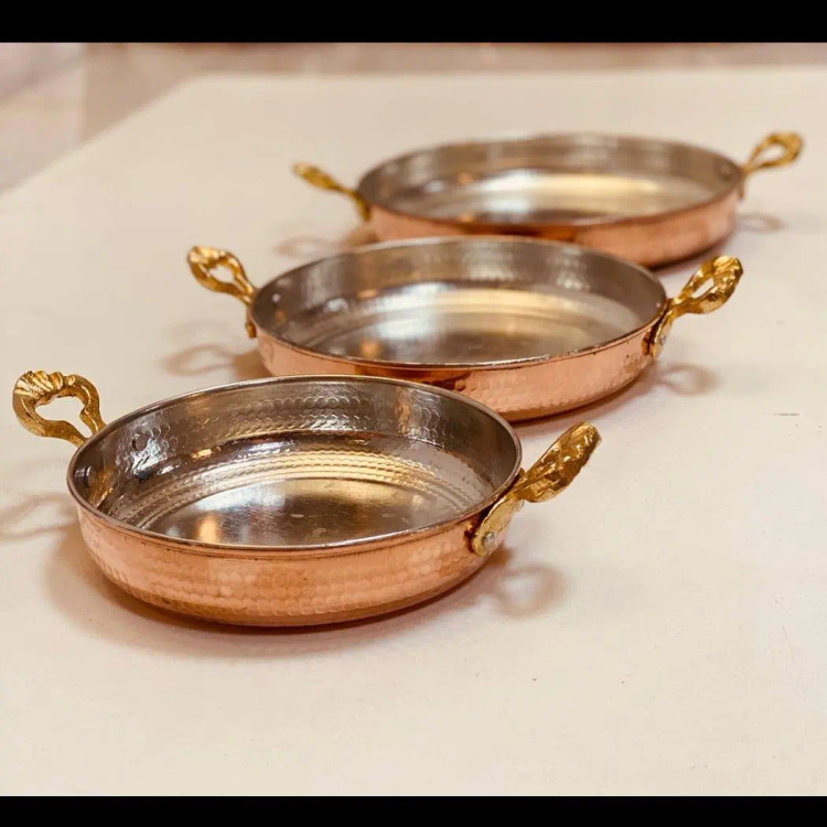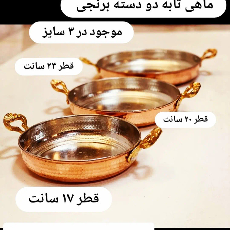 ماهی تابه مسی دو دسته برنجی 3 عددی در 3 سایز قطر های 17 سانت .21 سانت.24 سانت